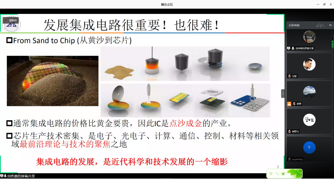 践初心使命,聚焦铸魂育人,由党支部纪检委员、电子科学专业系主任刘伟景围绕集成电路新专业建设的初心与使命,向出席的党员同志分享了集成电路的发展现状、人才需求和发展使命,面对集成电路芯片国家重大战略需求,号召各位党员同志不忘初“芯”,砥砺前行。