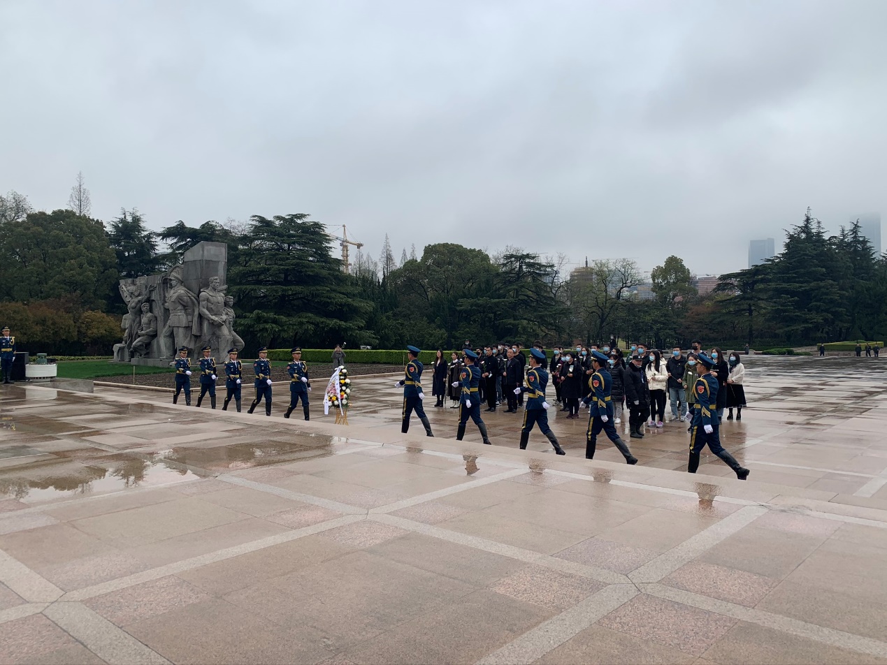 当日细雨绵绵,显得陵园更加肃穆。在致敬英雄环节,在庄严肃穆的音乐中,大家排好队伍、手持白菊,在纪念碑前肃立。仪仗队入场,而后奏响国歌。由电信学院党委书记潘耀芳同志和彭镇中学党支部书记金杰上前献上花篮,向革命先烈致以崇高敬意和哀思。全体人员面向纪念碑三鞠躬,表达对革命烈士的沉痛悼念。最后,全体成员有序上前,献上白菊,以示哀思。