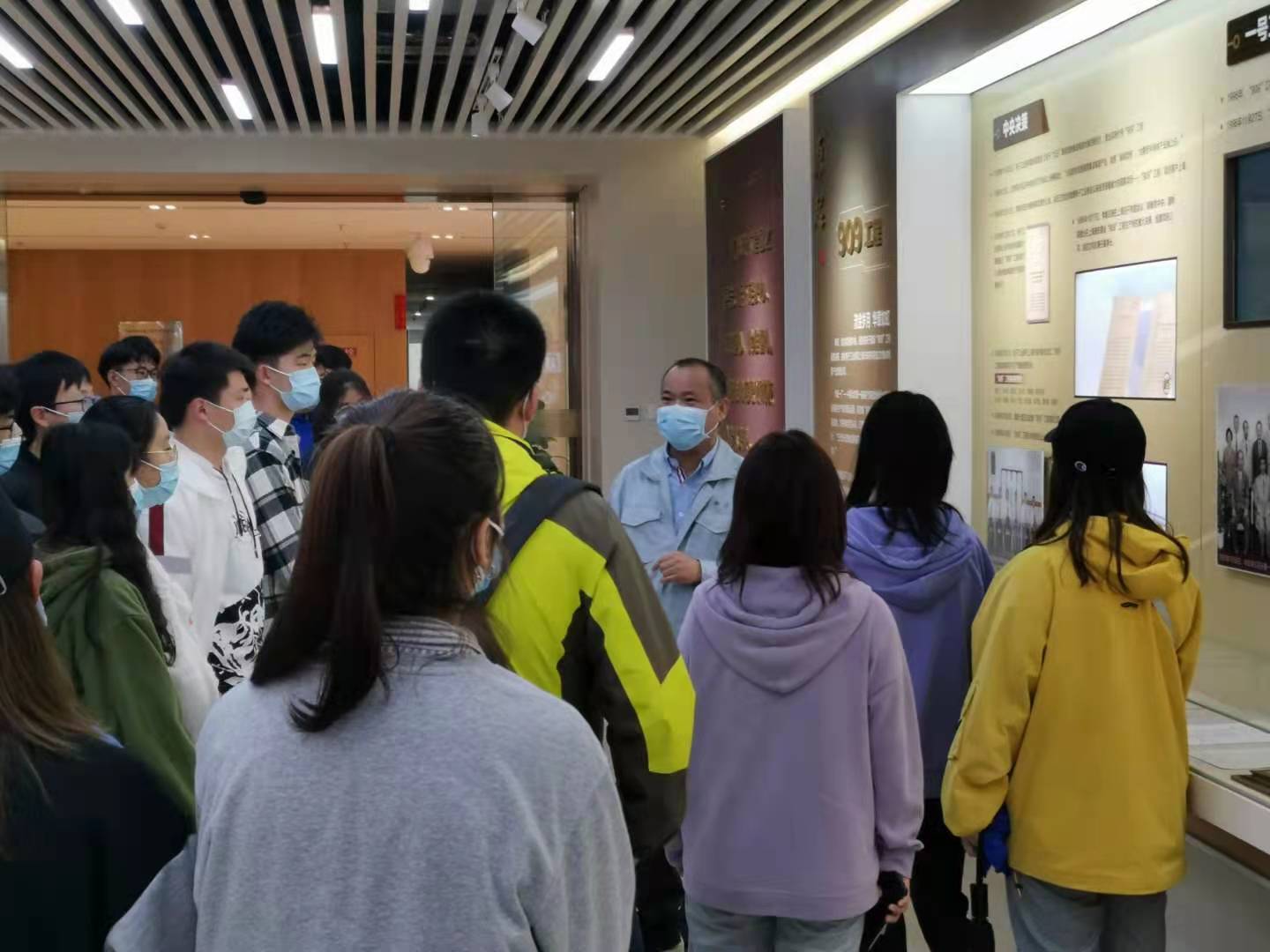 宣讲交流结束后,师生共同参观了华力公司的展厅和生产线。在展厅中,王维元为我校师生介绍了华虹集团的起源、发展和取得的成就。华虹集团作为承担国家“909”工程主体生产线建设运营单位,已经走过二十年的“芯”路历程,现如今华力生产的12英寸芯片已经应用到生活的各方面。在对芯片制造生产线的参观过程中,讲解员为大家详细介绍了芯片生产流程、生产工艺以及超净车间环境,包括华力公司自主研发的全自动物流搬运系统、光刻技术,同学们体验了全上海最干净的空气净化系统和国内最先进的生产线。