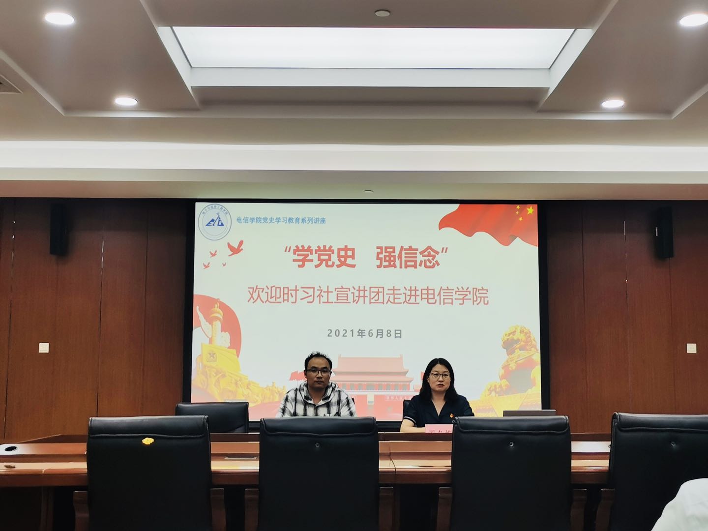 为庆祝中国共产党成立 100 周年,引领校内广大学生知史爱党、知史爱国,通过传承红色基因、讲好百年故事,进一步增强“四个意识”、坚定“四个自信”、做到“两个维护”,坚定不移地听党话、跟党走,6月8日,校时习社大学生理论宣讲团走进电信学院,在学术楼303报告厅举行“学党史 强信念”专题宣讲活动。校时习社大学生理论宣讲团指导教师、校融媒体中心主任赵铮,电信学院党委副书记周冬梅,大学生理论宣讲团宣讲成员出席活动,活动由赵铮主持。
