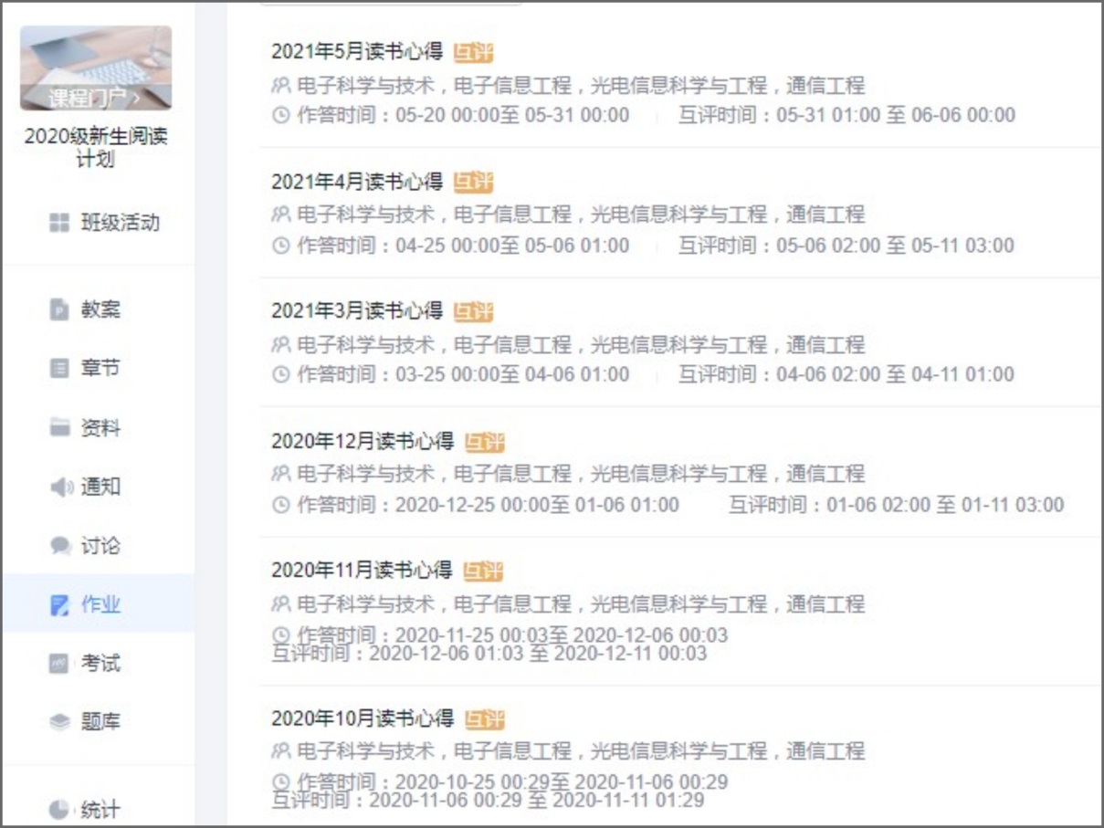 本次新生阅读活动从2020级学生入学时开始,贯穿2020级学生的整个大一学年。学生通过每月阅读一本书籍,并撰写一篇读书心得的形式,树立阅读意识,养成良好阅读习惯。同时,为促进同学们共同进步,学院鼓励学生每月定期将自己的阅读心得上传至超星学习平台,与专业其他同学进行互评打分,学习优秀心得,了解更多优秀书籍。