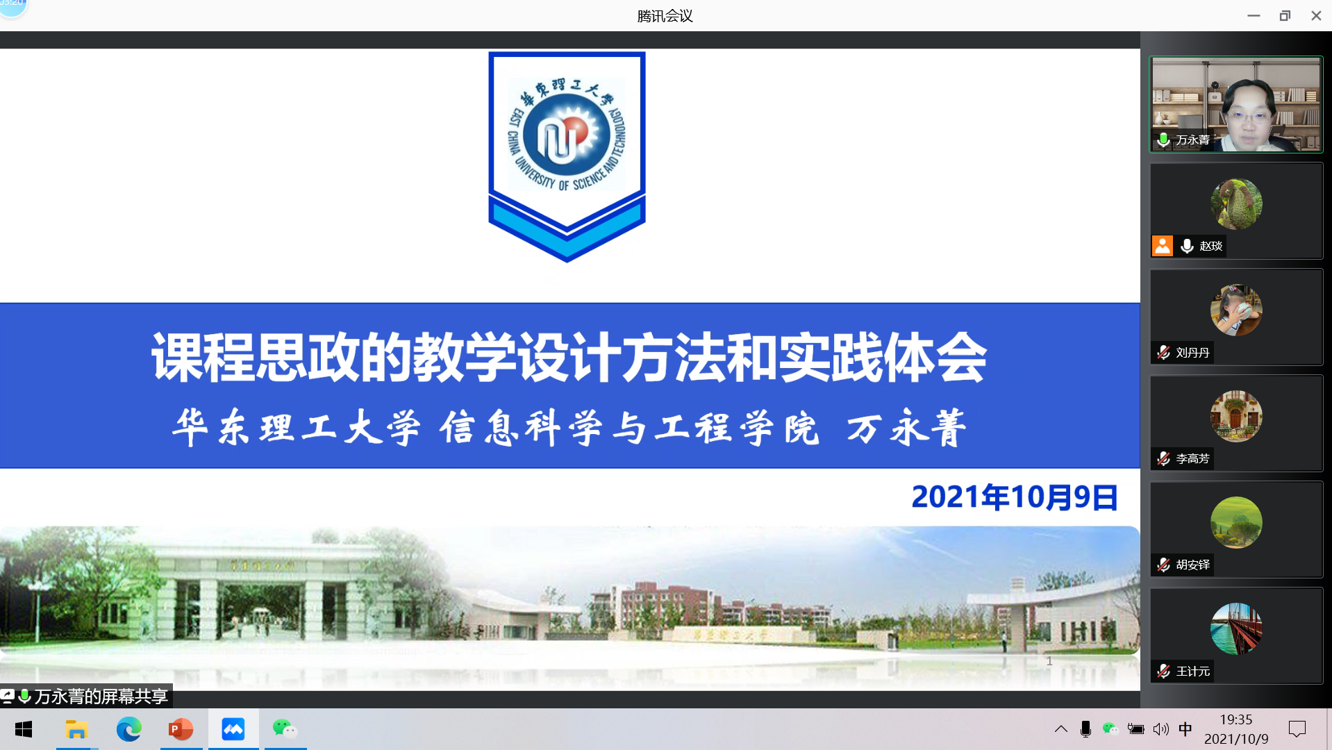 为了推进学院各专业课程思政建设,109日晚,电信学院邀请教育部教学名师、华东理工大学教务处副处长万永菁教授做了题目为“课程思政的教学设计方法与实践体会”的线上报告。电信学院领导及专业教师参加了报告会,赵琰副院长主持会议。