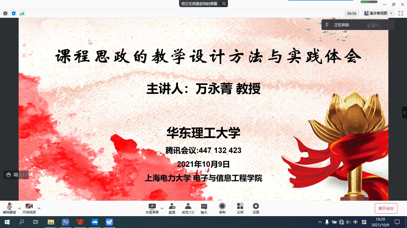 万永菁教授的报告将理论与实践结合,图文并茂地展示了课程思政的教学设计方法方法,给予参会教师以深刻、直观的启法。该报告会的举行将有力促进电信学院课程思政项目建设水平提升。