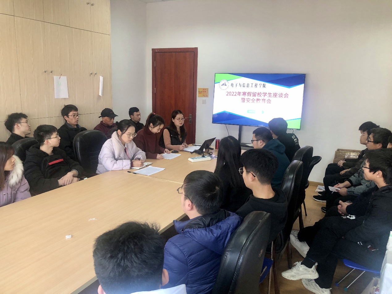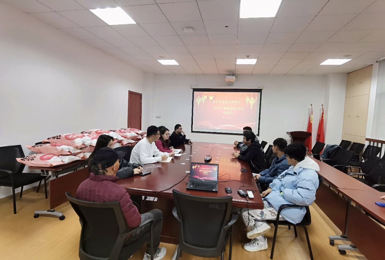 127日上午,窗外阴雨绵绵,室内暖意融融,电信学院在电计楼B402会议室开展2022年寒假留校学生慰问活动,学院党委副书记周冬梅、团委书记李天成与留校学生欢聚一堂。