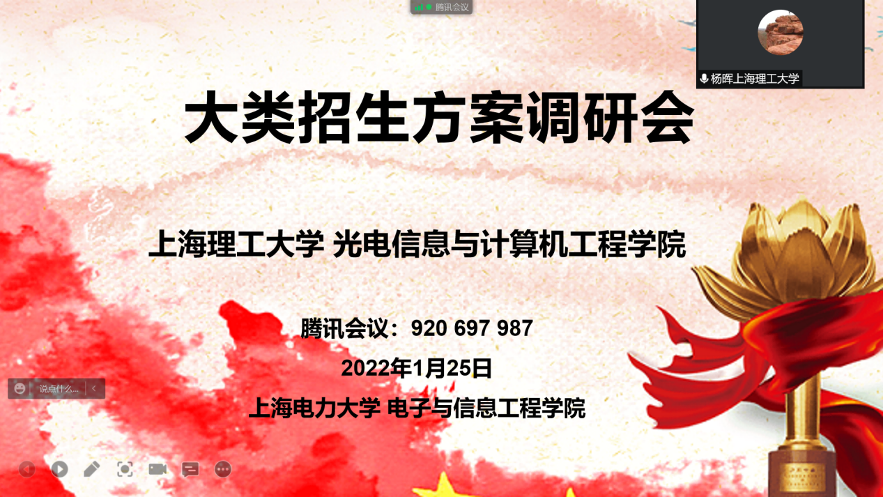 进一步推进学院大类招生试点工作,125日,电信学院线上举行大类招生方案调研会,邀请上海理工大学光电学院院长杨晖做了关于大类招生的经验分享报告,电信学院副院长赵琰和各专业负责人参与了交流讨论。