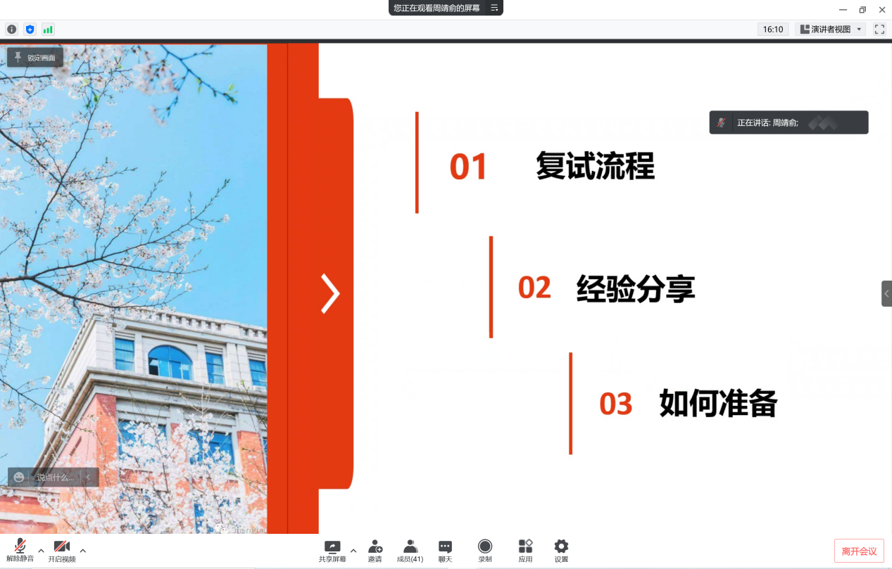 周靖俞(目前就读于上海理工大学)强调要把握模拟复试的机会确认设备、音频、视频等是否正常,网络状态是否良好以及环境是否符合要求。在复试过程中要注意自己的精神面貌,回答问题时要礼貌谦虚。