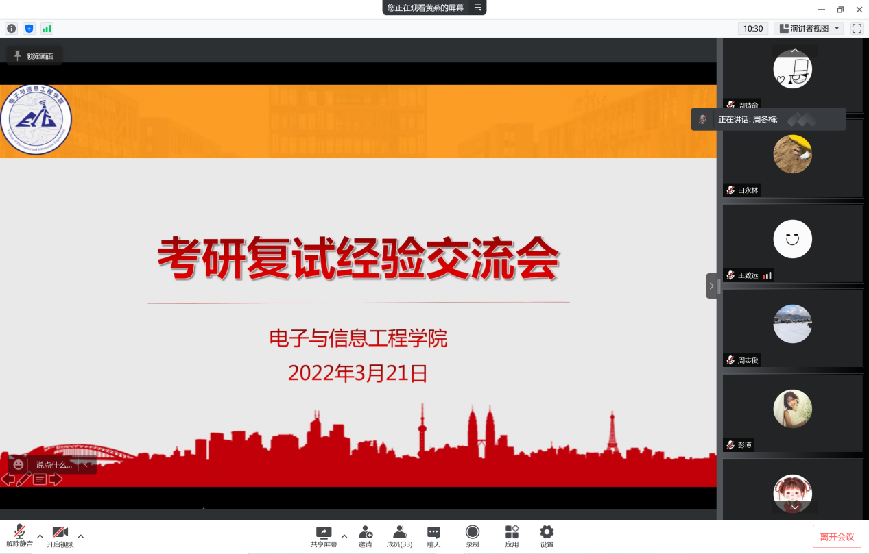 抗疫不停学在这段特殊时期为了使进入考研复试的同学掌握更多相关技巧,以良好的状态备战复试365best体育亚洲官网于321日晚上700举办了线上“考研复试经验交流会”。电信学院党委副书记周冬梅光电科学与信息工程专业教师薛亮就业专项负责人黄燕毕业班辅导员许晓天崔释匀参会会议邀请了往届优秀学子进行分享。