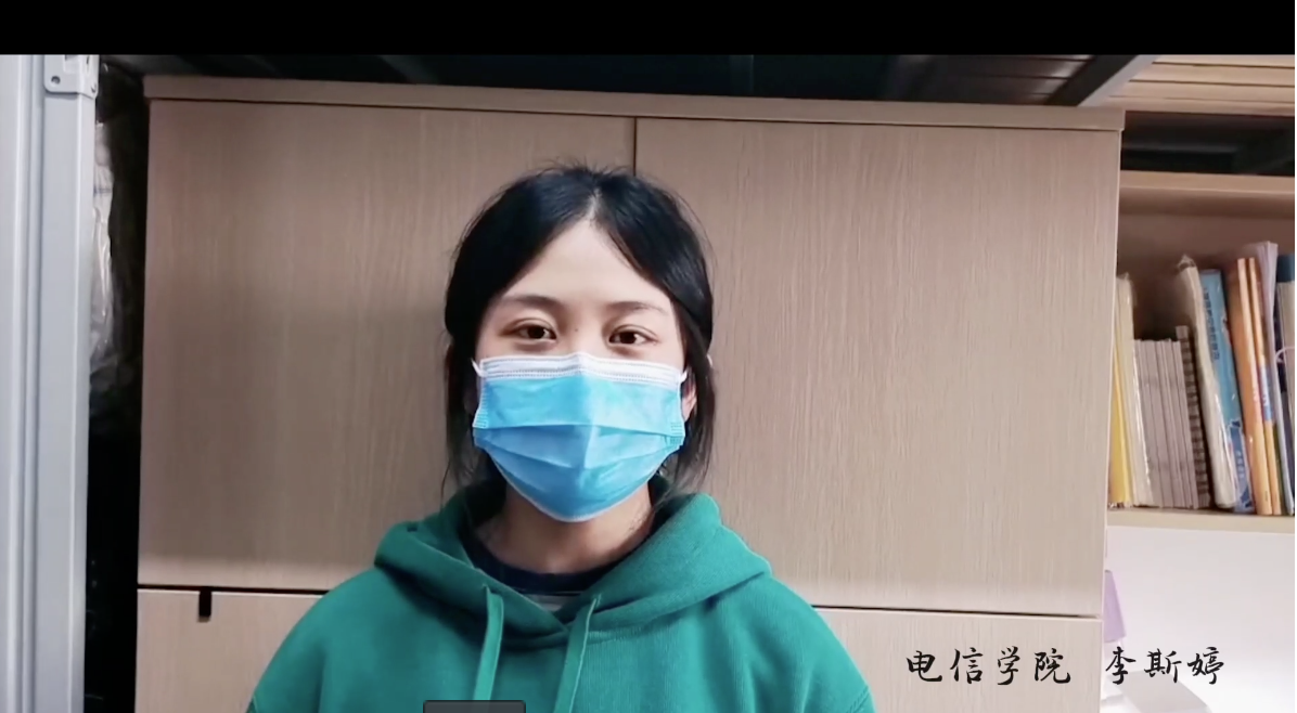 2019级电子信息工程专业刘一鸣说:“科学防疫,我们一马当先。在疫情防控班会的学习中,我感受到了新冠奥密克戎病毒的来势汹汹,也更震撼于援沪医疗队及防疫志愿者在疫情战场上逆行的勇气和伟大的奉献精神。我认为作为新时代的大学生,积极响应落实学校的各项防疫工作,是对疫情防控最基本的贡献也是最大的贡献。在日常注意防疫的同时也要积极投身于志愿者的队伍中,为同学为学校做真正有意义的服务。疫情当前,我们携手守!”
