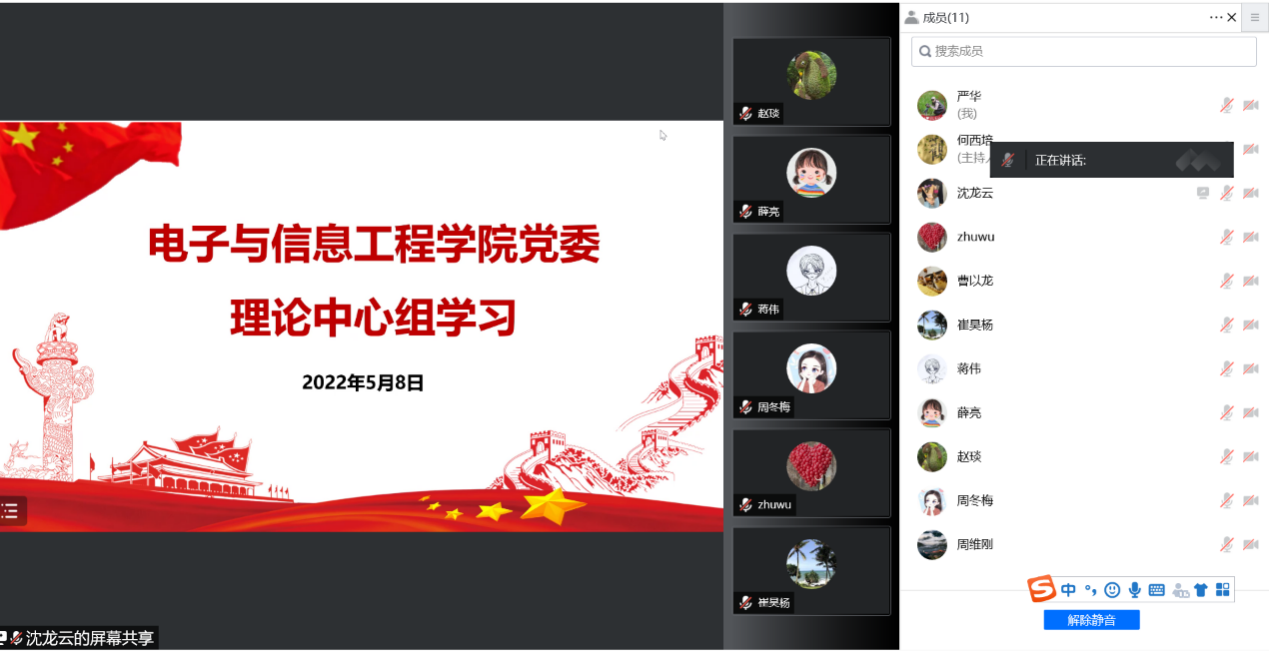 5月8日下午,电信学院党委举行理论学习中心组专题学习会,深入学习贯彻中共中央政治局常务委员会和上海市委常委会议精神。学院党委书记何西培主持会议,校党建服务中心/督查室周维刚出席指导。学院党委中心组全体成员参会。