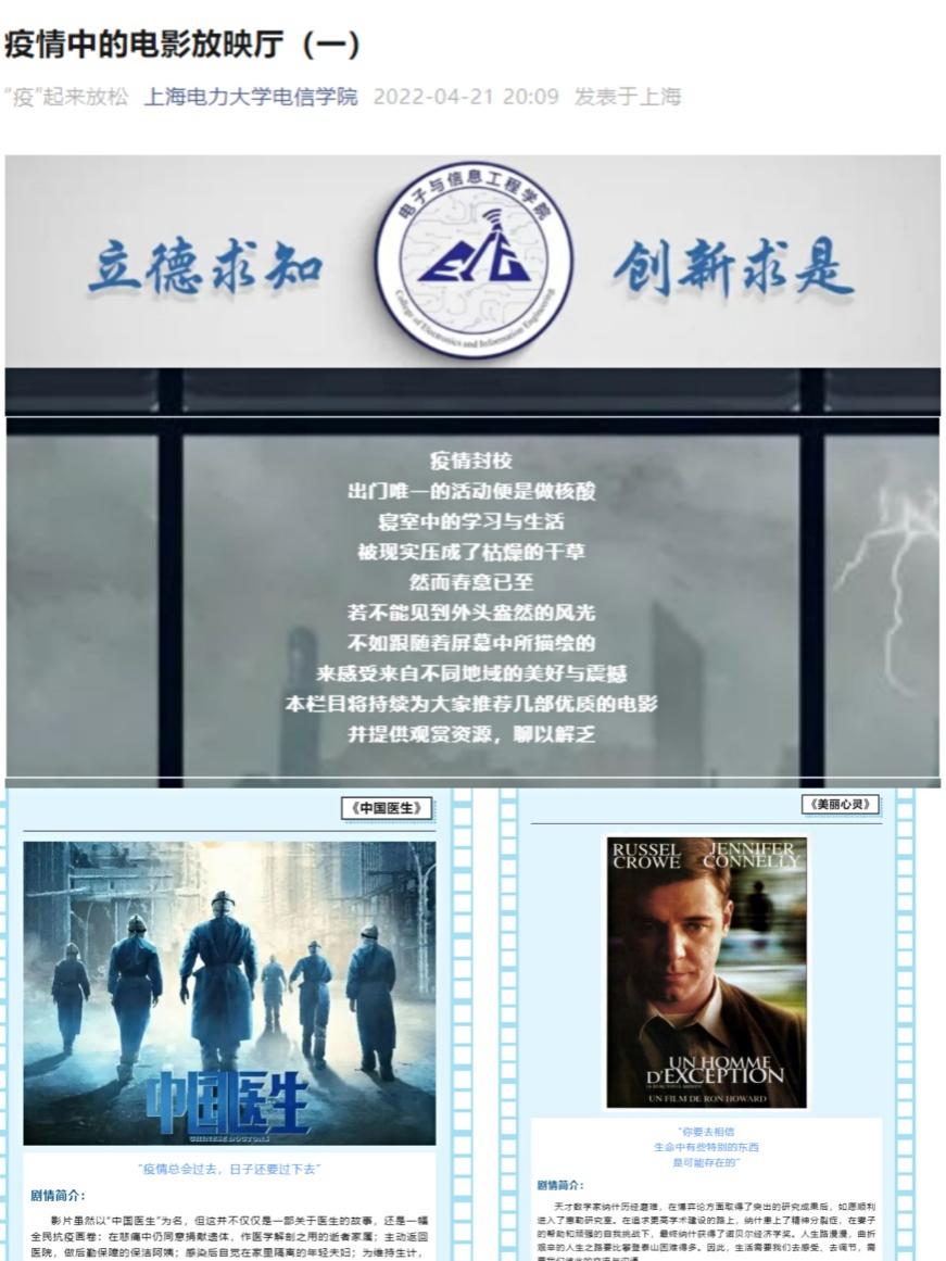 学院通过寻找与感恩、励志、诚信、疫情防控相关的优质电影,并推荐给学生,丰富学生业余生活的同时,潜移默化地强化学生责任担当,并使其入脑入心。
