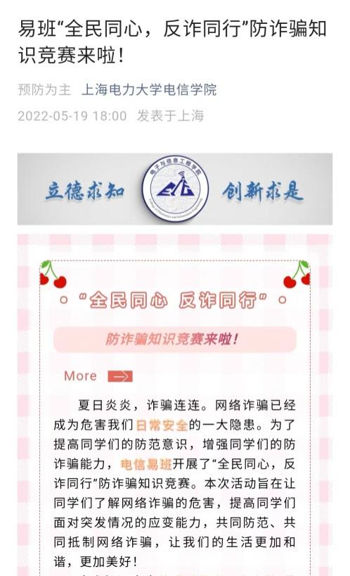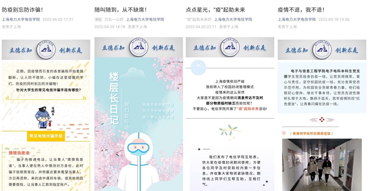在诚信教育主题活动中,电信学院利用微信公众号平台,开设专刊,从“防疫别忘防诈骗”角度宣传防诈骗内容,并结合本次防疫工作中涌现出的优秀师生事迹强化诚信感恩教育,在学生群体中起到了良好的宣传效果。