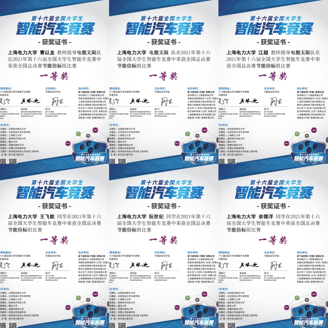 近日,来自电信学院的智能车车队“电靓无限”于2021年第十六届全国大学生智能汽车竞赛中获得节能信标组全国第五名(并列)的好成绩,成功摘得全国一等奖;与此同时,参加2021年全国大学生物联网设计竞赛(华为杯)的“空天地立体化智慧电网线路守卫者”小队也传来捷报,一举摘得全国一等奖。