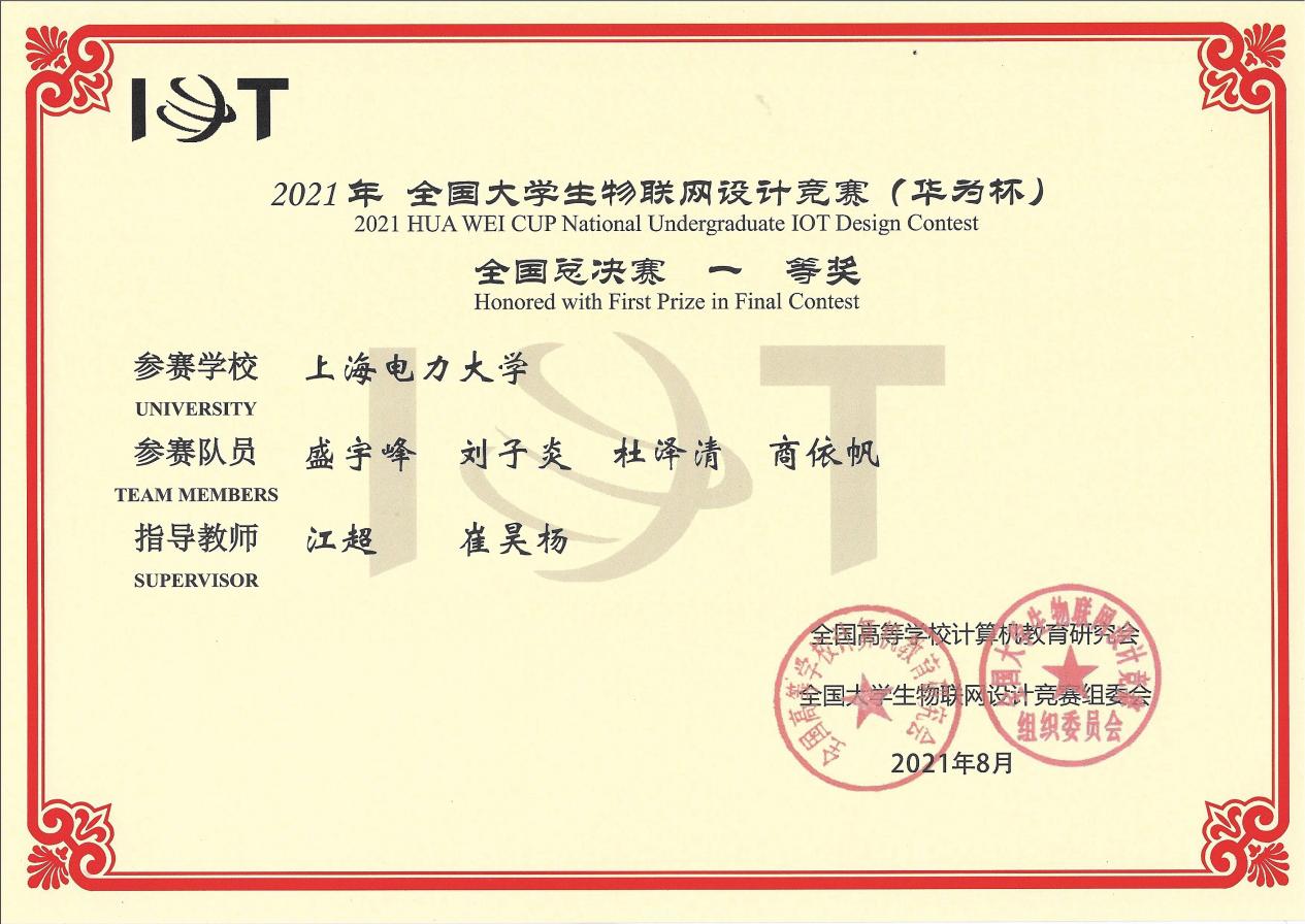 由华为技术有限公司冠名赞助的2021年全国大学生物联网设计竞赛(华为杯)共吸引了来自571所高校的1475支队伍,参赛学生规模达6945名,指导教师1461名。由电信学院盛宇峰、刘子炎、杜泽清、商依帆同学组成,江超老师、崔昊杨教授指导的“空天地立体化智慧电网线路守卫者”小组通过选择自主命题赛道,一路过关斩将,杀入全国总决赛,并与145支参赛队伍通过在线视频答辩、6强争霸等环节展开了最后的角逐。在经过国内几十所高校和企业的32位评审专家严格细致的把关后,成功获得全国一等奖。