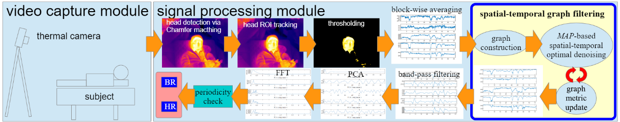 该项研究提出了一种基于面部区域图结构特性的高效时空图信号降噪算法,有效提高了热成像视频中的个体呼吸率及心率的非接触式估计的精度。