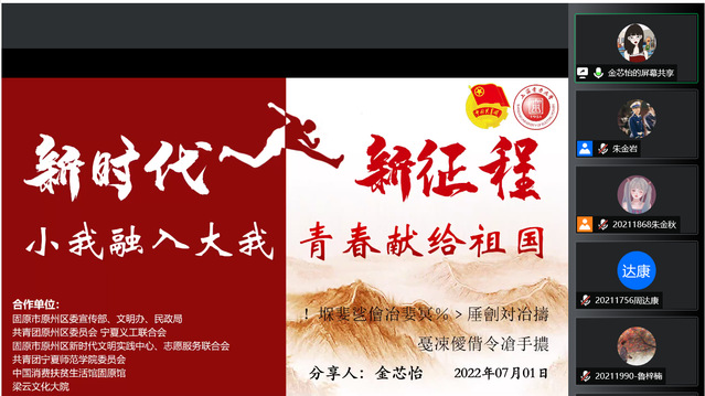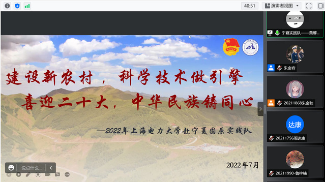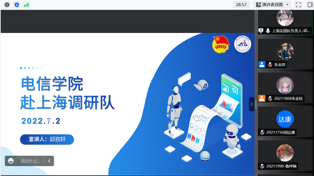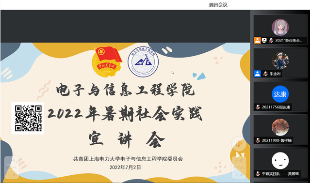 7月2日下午,电信学院2022年暑期社会实践宣讲会于线上顺利开展,到场嘉宾有365best体育亚洲官网团委书记李天成,团委副书记助理王惠,宁夏固原实践队代表黄馨瑶、顾佳明,上海实践队代表邱孜轩、马文骏,2021宁夏固原实践队队长金芯怡以及往届实践队的部分队员。