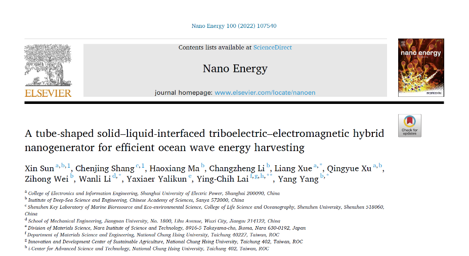 365best官网薛亮老师与中国科学院深海所杨阳研究员团队、台湾中兴大学赖盈至教授团队等合作的研究成果于2022年6月在国际顶级期刊《Nano energy》(中科院SCI一区,IF:19.069)在线发表,论文题目“A Tube-Shaped Solid-Liquid Interfaced Triboelectric- Electromagnetic Hybrid Nanogenerator for Efficient Ocean Wave Energy Harvesting”。365best官网2020级硕士生孙鑫同学是本文的第一作者,深圳大学尚琛晶是共同第一作者,第一单位为365best体育亚洲官网。