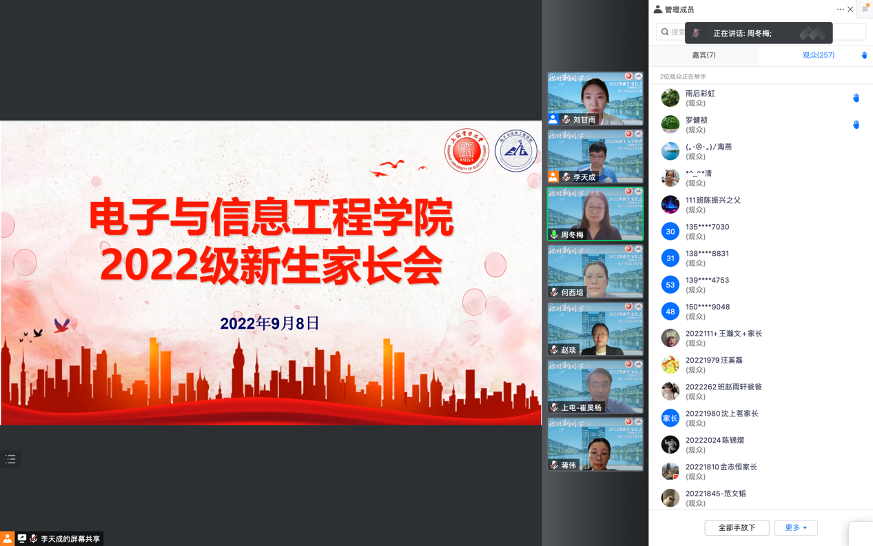 9月8日晚,电信学院召开了全体新生线上家长会,向新生家长们介绍了学校、学院、专业情况、学生学籍管理、考研升学、学生事务管理等工作,帮助新生家长们进一步了解学生进入大学之后的管理体系、学习内容和发展方向,引导新生家长主动关心学生学业规划、心理健康以及环境适应等问题,明确大学阶段家长的职责,增强家校合作,实现家校共育,助力和保障每一位学生成长成才。