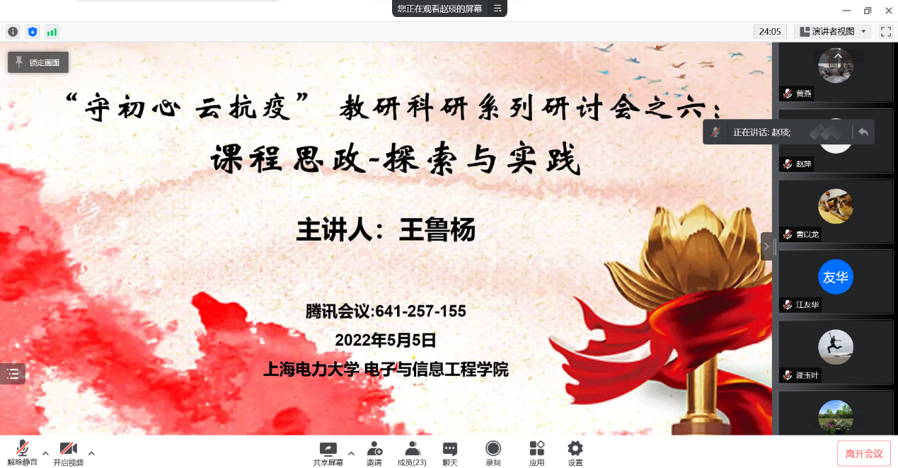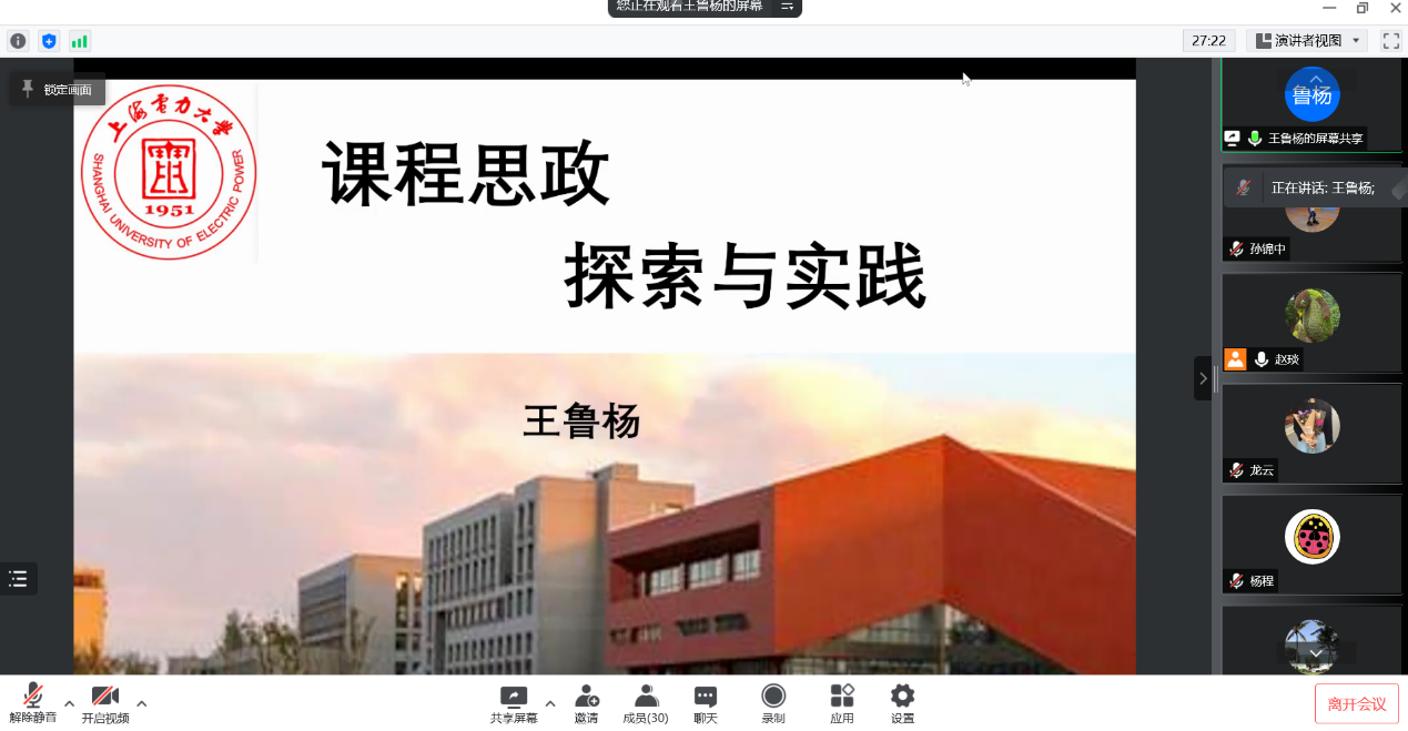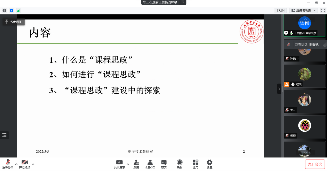 5月5日,365best体育亚洲官网邀请了电气工程学院电子教研室主任王鲁杨老师在腾讯会议线上为学院教师主讲题为《课程思政-探索与实践》的学术讲座。学院党政班子领导和各专业教师参加了会议。