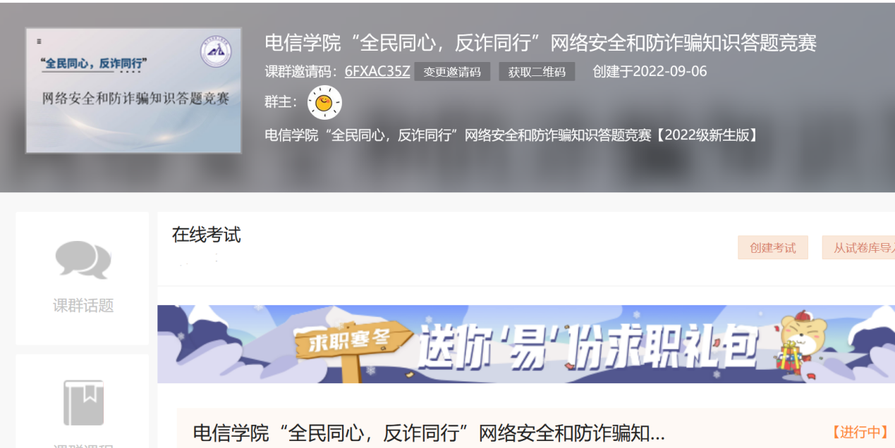 为积极响应2022年国家网络安全宣传周校园日活动的号召,提升学生网络安全意识和安全防护技能,9月5日至11日电信学院围绕“网络安全为人民,网络安全靠人民”活动主题,广泛开展形式多样的宣传教育活动。