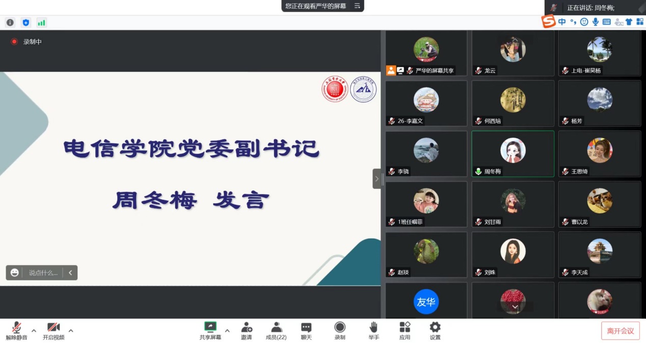 在喜迎党的二十大召开之际,为深入学习贯彻习近平总书记关于教育的重要讲话精神,充分发挥先进典型的示范带动作用,引领学院教师争做党和人民满意的“四有”好老师,9月23日上午,电信学院以线上腾讯会议的形式组织开展“厚植教育情怀 学做‘四有’好教师”教师代表座谈会。学院党政班子成员、江友华教授、全体辅导员、2022年度新进教师和各系部教师代表出席会议。会议由学院党委书记何西培主持。