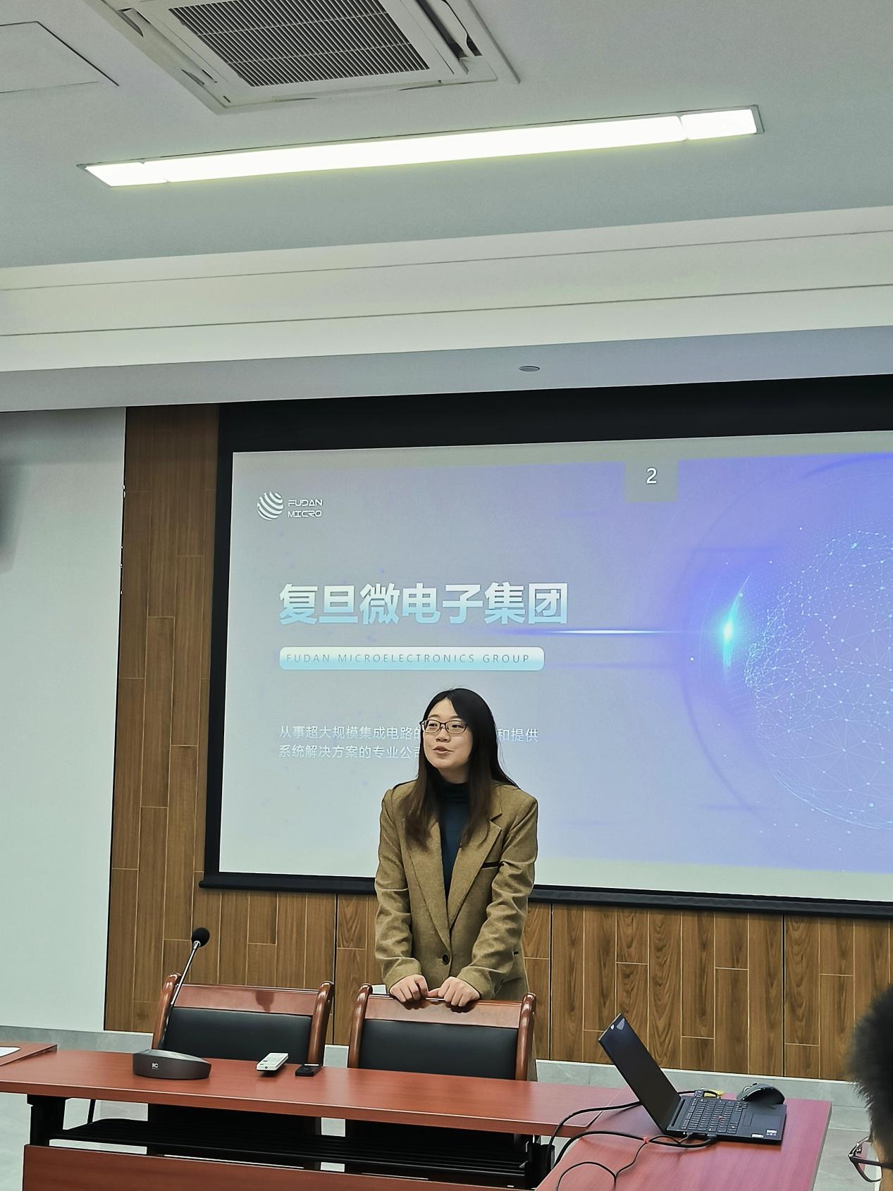 11月22日下午,上海复旦微电子集团股份有限公司(以下简称“复旦微电子”)2023届校园招聘宣讲会在我校临港校区学术楼305会议室举办,复旦微电子人力资源部吕沁沁,工程师袁翔,就职于复旦微电子的电信学院2021届毕业生刘琦,电信学院党委副书记周冬梅,毕业班辅导员王思绮出席会议,宣讲会采用线上线下相结合的方式展开,我校近80余名毕业生参加。