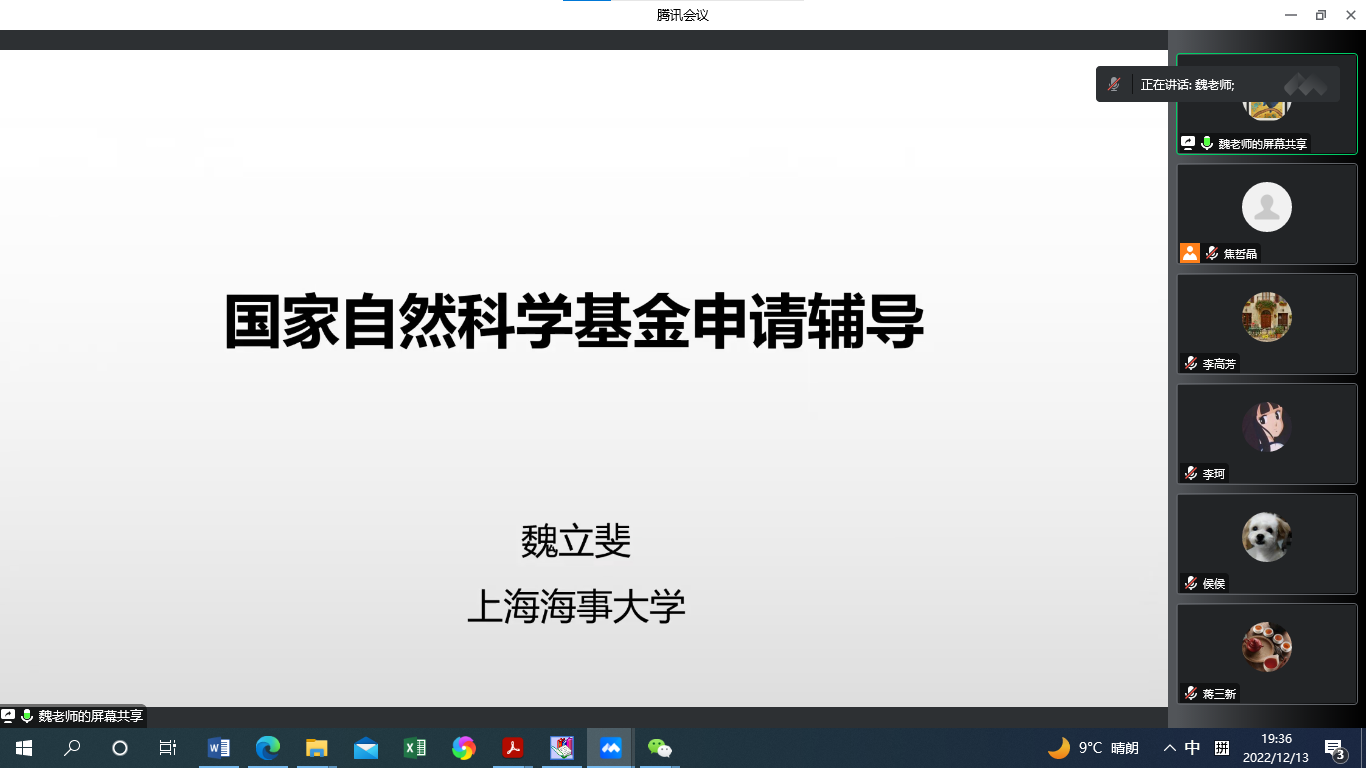 2022年12月13日19:30,365best官网主办的“2023年国家自然科学基金申报系列活动”第4期成功举办。本次活动邀请了上海海事大学信息工程学院魏立斐教授作国家自然科学基金申报讲座。讲座由副院长蒋伟主持,学院近20名教师参加了会议。