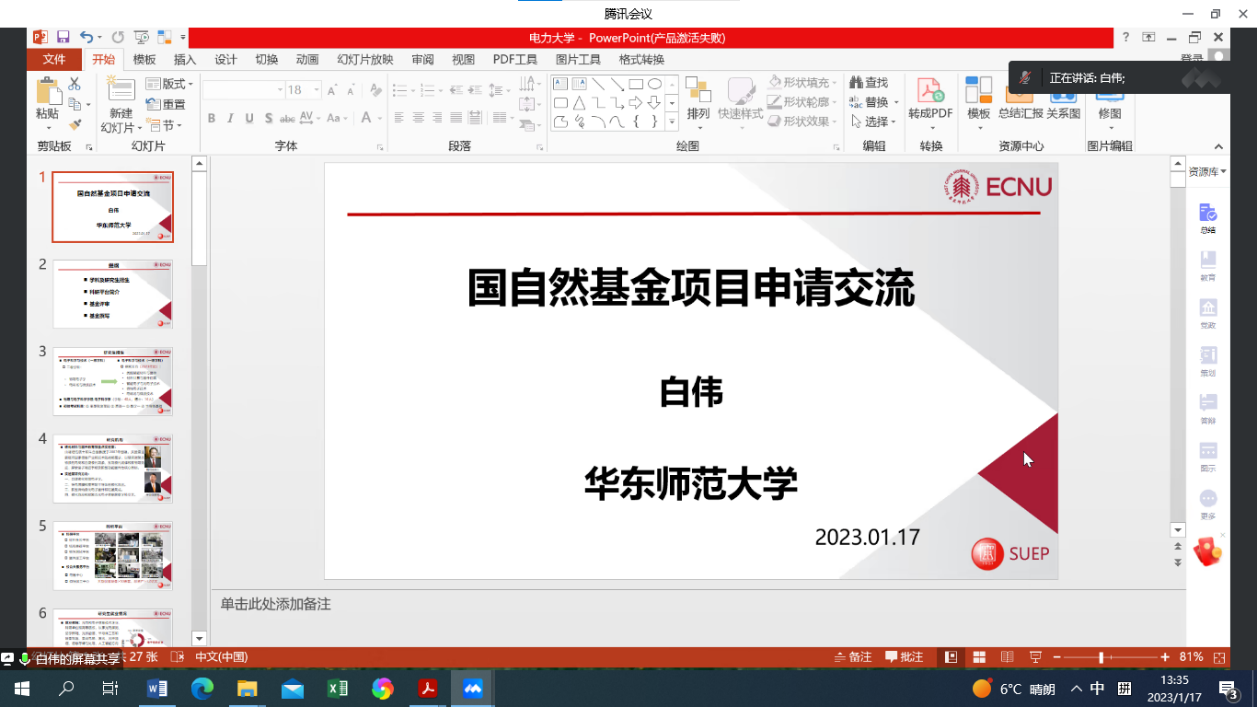 2023年1月17日下午13:30,365best官网主办的“2023年国家自然科学基金申报系列活动”第6期成功举办。本次活动邀请了华东师范大学物理与电子科学学院白伟副研究员作国家自然科学基金申报讲座。讲座由副院长蒋伟主持,学院30余名教师参加了会议。