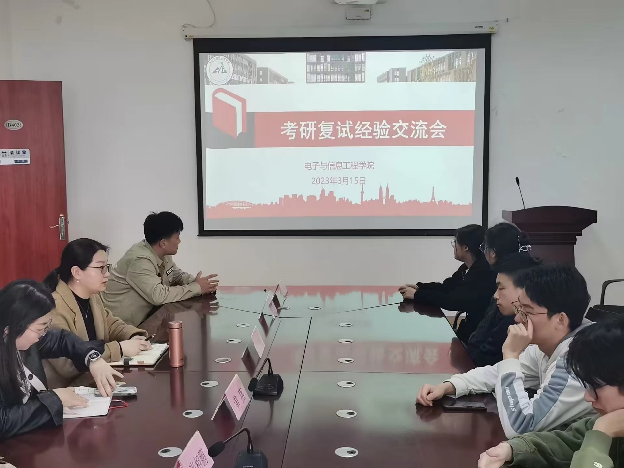 为做好2023届毕业生考研复试、调剂服务工作,提高复试成功率,电信学院于3月15日以线上线下相结合的形式开展了考研复试经验交流会。会议邀请到来自电子科技大学、上海大学、上海理工大学以及我校的7位优秀校友分享复试经验,学院党委副书记周冬梅、光电信息科学与工程专业教师薛亮、就业专项负责人黄燕以及2023届考研学生参加此次活动。