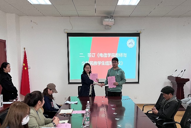 随后,周冬梅作为教师代表与2022111班的少数民族学生代表努尔艾力·图拉克签订了《电信学院教师与少数民族学生结对协议》。学院通过一对一结对的形式深入开展对少数民族学生的关心和关爱,在思想引领、学业指导、生活帮扶、身心健康等方面为学生提供各项服务和保障,培养学生的家国情怀,努力提升学生各方面的能力和素质。