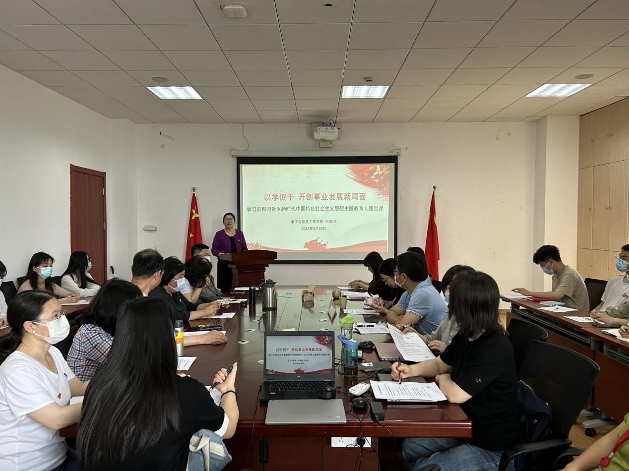 根据学校学习贯彻习近平新时代中国特色社会主义思想主题教育安排,5月30日,电信学院党委书记何西培以“以学促干 开创事业发展新局面”为主题,向学院师生讲授专题党课。学院党政班子成员、党支部书记、骨干教师、所在党支部党员及联系党支部党员参加,校主题教育第三巡回指导组陈静到会指导。