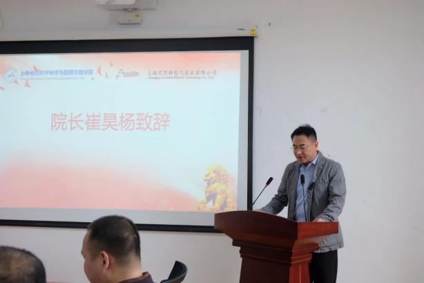崔昊杨对上海艾思逊电气技术有限公司相关领导的到来表示热烈欢迎,并预祝本次活动取得圆满成功。同时,他对学院产学研合作情况进行了介绍,电信学院始终秉承开放、创新的理念,与众多优秀的企业紧密合作,建设了一批校外实践基地和联合实验室,校内外共同合作培养学生的创新精神、创业意识和实践能力。他表示,希望后期与艾思逊公司深层次合作,不断推出前瞻性和战略性的举措,为双方的产教融合、联合实验室的建设做出成效。