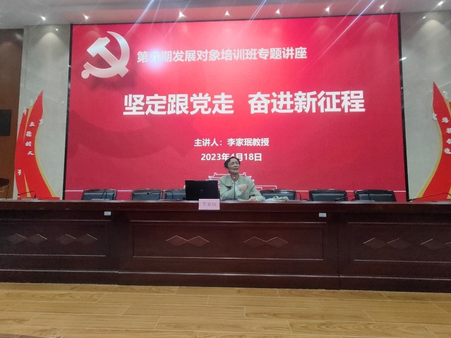 学校党的二十大精神宣讲团成员李家珉教授以《坚定跟党走奋进新征程》为学员们开展专题讲座。李教授用丰富的史料和生动的语言,讲授了中国共产党的发展历史,让习近平新时代中国特色社会主义思想和党的二十大精神入脑入心,他勉励学员们要坚定理想信念,全面提升综合素质、奋发有为,引导学员们要强化使命担当和责任担当,将青春奉献给伟大的祖国和伟大的时代,引起全场学员共鸣。