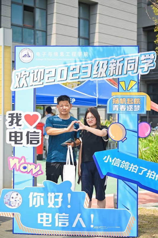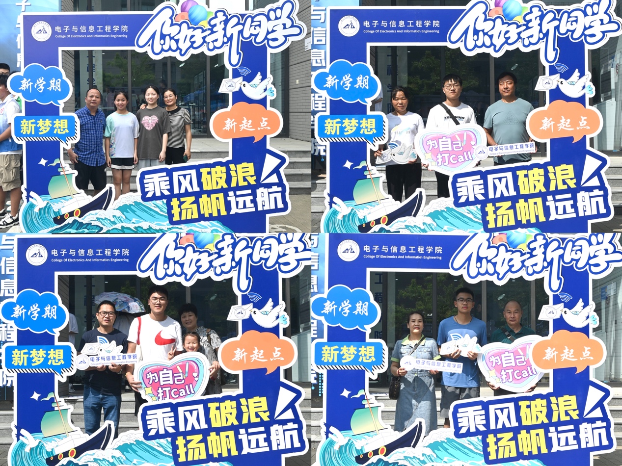 精心准备,迎新生。为迎接新生的到来,电信学院精心设计制作了带有学院元素的欢迎横幅与迎新展板,为新生们送上来自学院的专属祝福。精美的学院介绍、专业特色和科创成果等展板,加深了新生和家长们对学院办学特色及育人理念的了解。在“乘风破浪,扬帆起航”以及“你好电信人”的迎新展板前,新生们带着稚嫩的脸庞、洋溢着灿烂的微笑、散发着青春的活力,满溢着家人与师长的祝福与学院第一次同框合影。
