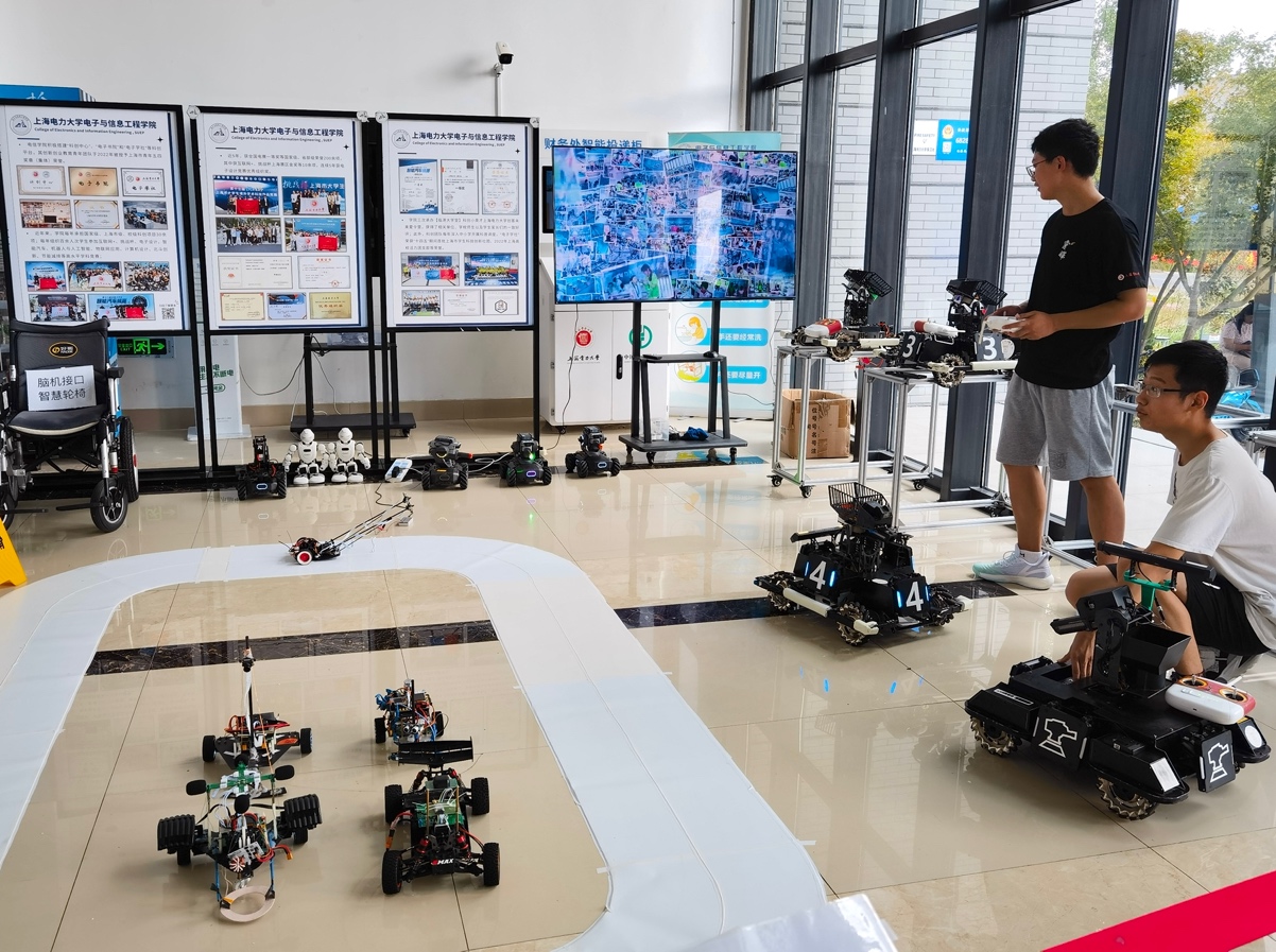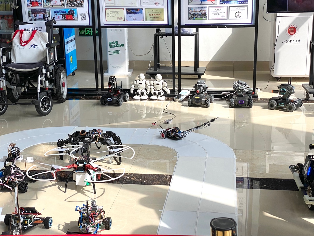 学院一楼报到大厅,设置了学生科创作品展区,脑机接口智慧轮椅、无人机、机甲战车等智能机器人在劲爆的音乐声中“舞动”,吸引了新生和家长驻足观看。近5年来,电信学院科创团队获全国电赛一等奖等国家级、省部级荣誉200余项,获互联网+、挑战杯上海赛区金奖等10余项,连续5年获电子设计竞赛优秀组织奖。学院的科创大门向每位新生敞开。