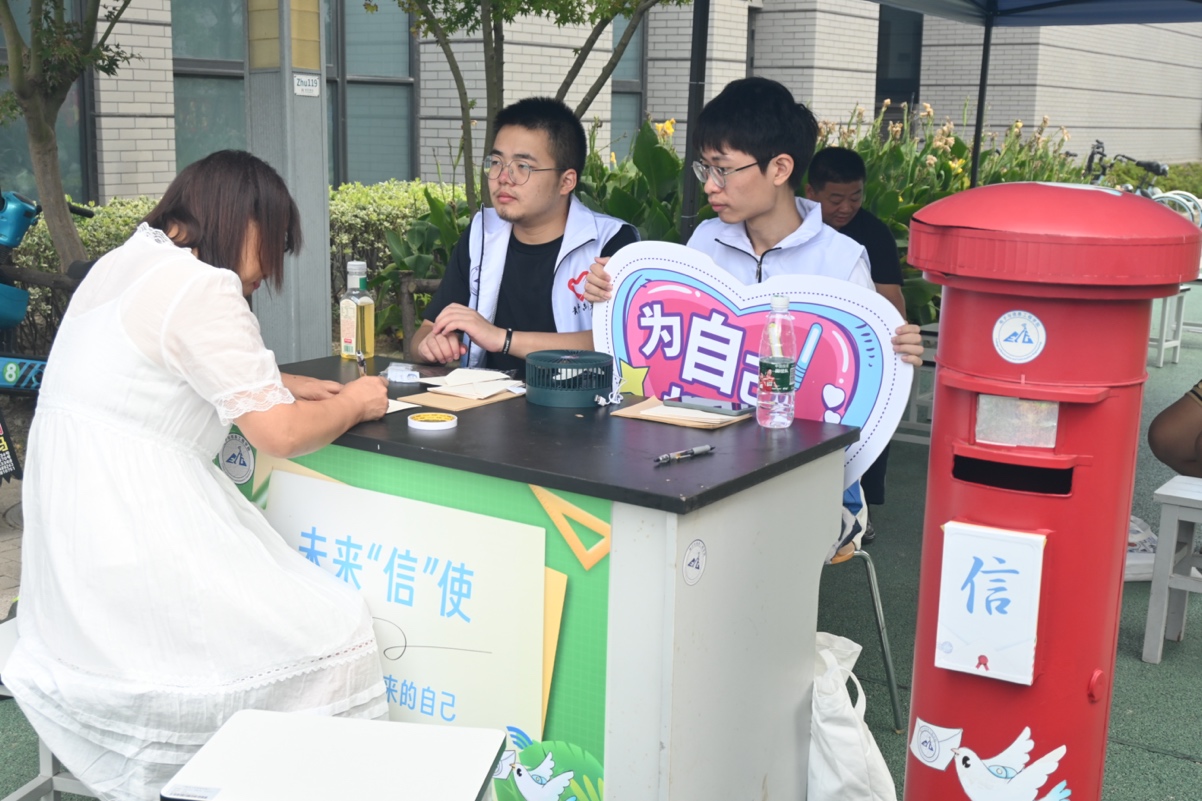 在学院门口,还设置了未来“信”使邮筒,志愿者向新生讲解着活动的意义,新学期、新起点,新生们纷纷在明信片上写下自己对大学的期待、对未来的规划以及对未来的自己想说的话,将期望与梦想寄于笔尖,投进邮筒中。