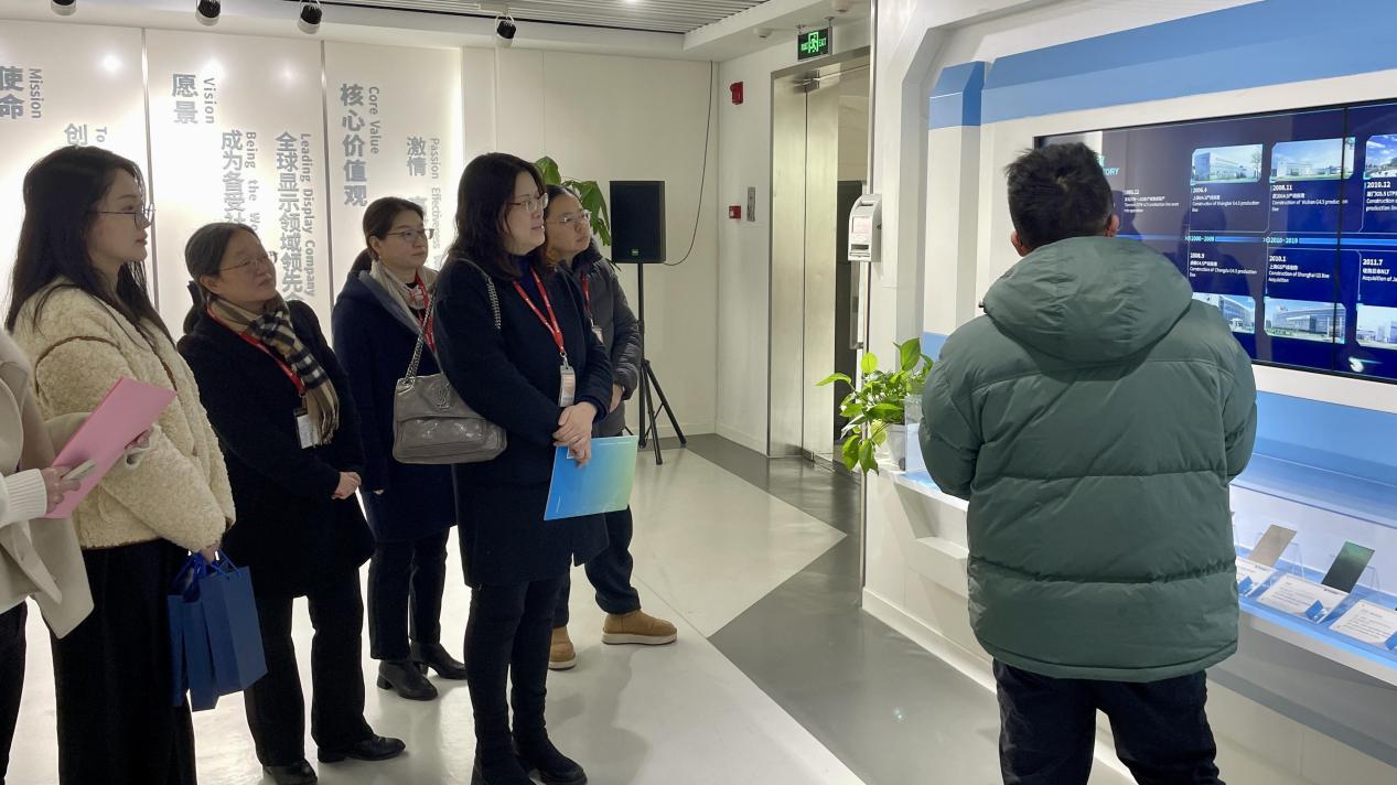 会前,学院一行参观了企业展厅,在市场部工作人员的介绍下,对天马微电子的发展历程、产业布局、行业地位等重要信息有了全面的认识。