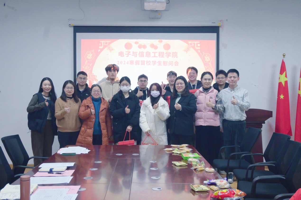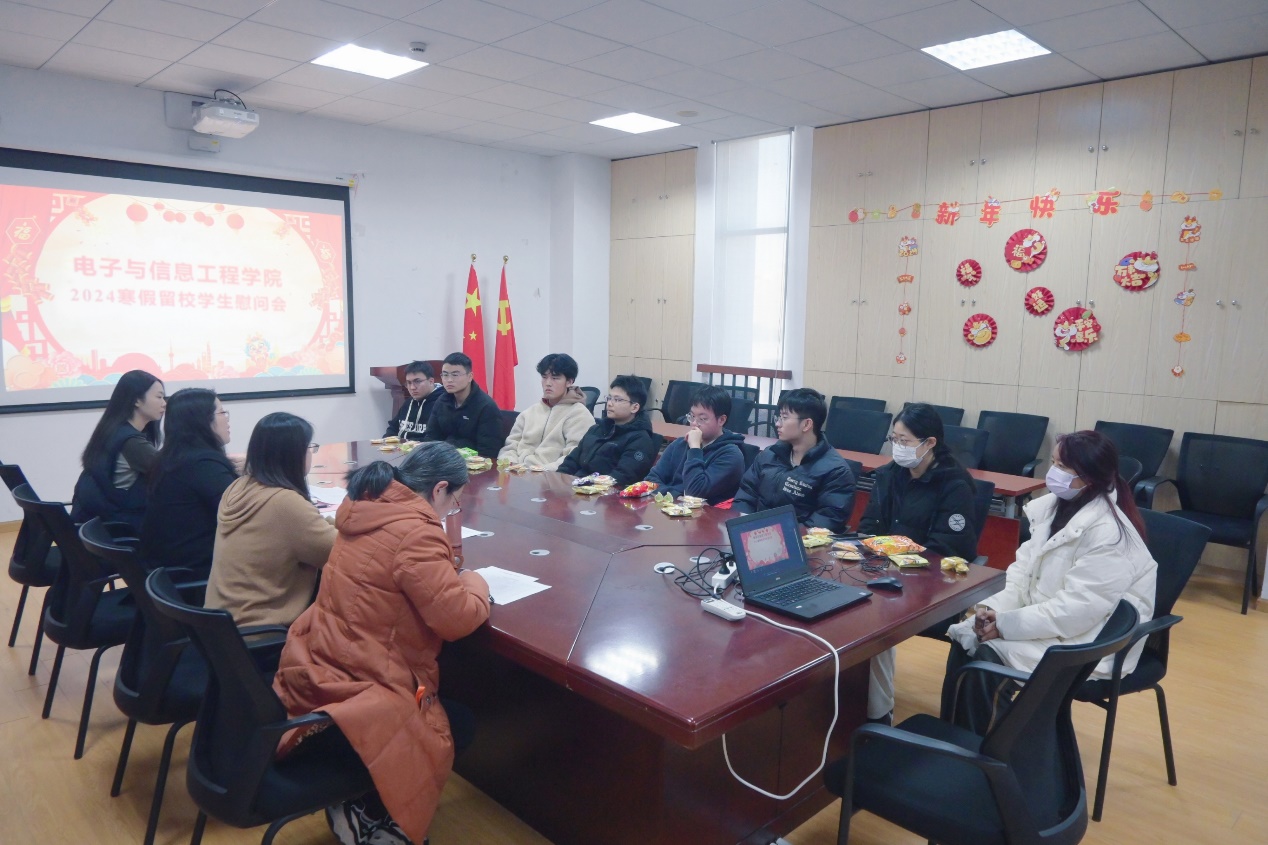 寒冬腊月,新岁将至。为做好寒假留校学生管理工作,关心留校学生学习生活,1月24日,电信学院在电计楼B402会议室开展2024年寒假留校学生慰问座谈会,学院党委书记何西培、党委副书记周冬梅、副院长赵琰、辅导员与留校学生欢聚一堂,为同学们送去学院的关怀和新春的祝福。