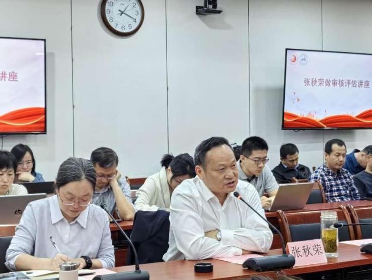会议邀请了上海海事大学张秋荣教授做审核评估专题讲座,张教授作为本轮审核评估上海方案课题负责人,详细介绍了本轮评估应该注意的重点,他从汇报、访谈、座谈会、课堂教学、抽查材料等六个方面指出了学院、教师在迎评工作中应注意的方面。