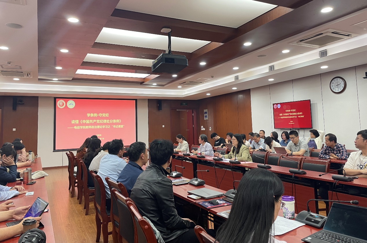 为落实学校党纪学习教育工作部署,认真学习贯彻《中国共产党纪律处分条例》,推动学院党纪学习教育走深走实。5月7日下午,电信学院在学术楼301会议室开展教师政治理论学习,学院党委书记何西培以“学条例,守党纪”为题作“书记课堂”,学院全体教职工参加。