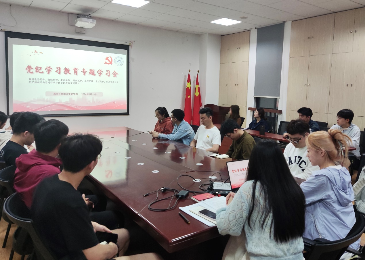 为深入开展党纪学习教育,进一步使党纪党规入脑入心,引导党员不断增强纪律意识,在支部内营造学纪、知纪、明纪、守纪的良好氛围,5月15日晚上,通信光电本科生党支部在电计楼B402会议室开展《中国共产党纪律处分条例》学习和党纪学习教育专题学习会,联系支部的电信学院党委书记何西培和支部全体党员参会,会议由支部书记刘甘雨主持。