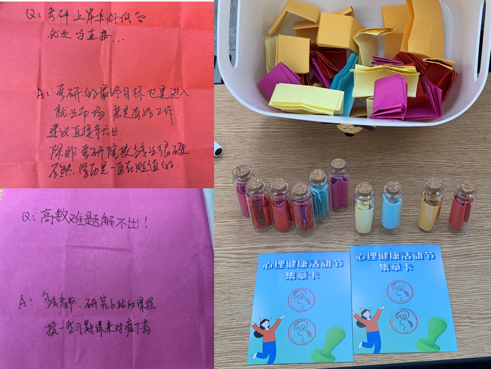 活动由两个模块组成,分别是“记忆卡片”和“情感瓶子”。在“记忆卡片”模块,参与者通过填词或绘画的方式,将近期遇到的开心或难过的事情记录在卡片上。在“情感瓶子”模块,参与者抽取其他同学的烦恼或困惑,并写下自己的解决方法或排解方式。通过此次活动,同学们不仅学习到了如何调适心理、化解压力,还在互动中感受到了彼此的支持和温暖。