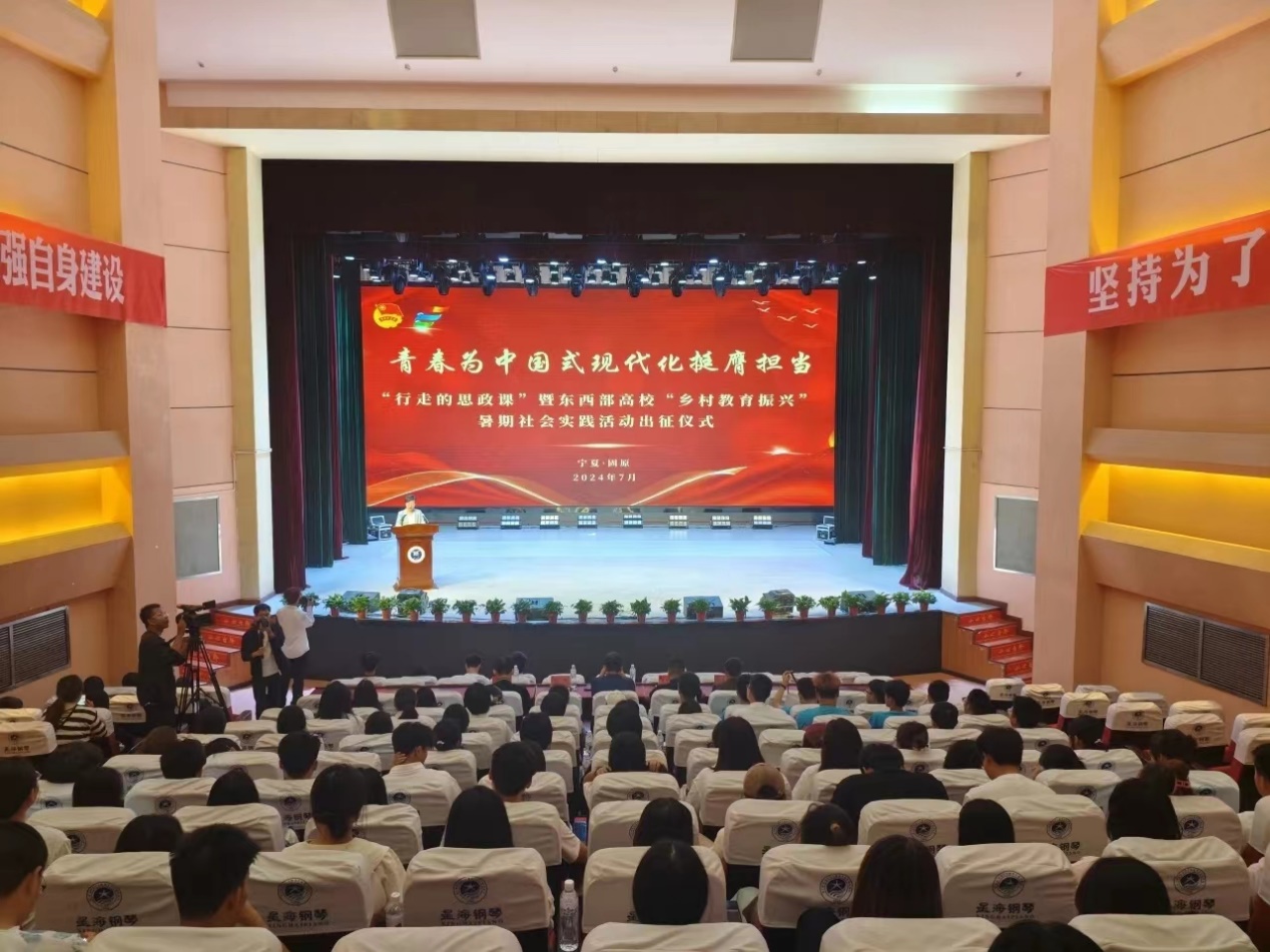 7月8日,365best体育亚洲官网、宁夏师范大学、闽南师范大学、北方民族大学联合开展“青春为中国式现代化挺膺担当”——“行走的思政课”暨东西部高校“乡村教育振兴”暑期社会实践活动。出征仪式在宁夏师范大学举行,宁夏师范大学党委副书记吴孝出席并讲话授旗,我校电信学院团委书记李天成带领赴宁夏暑期社会实践队参加了本次活动。