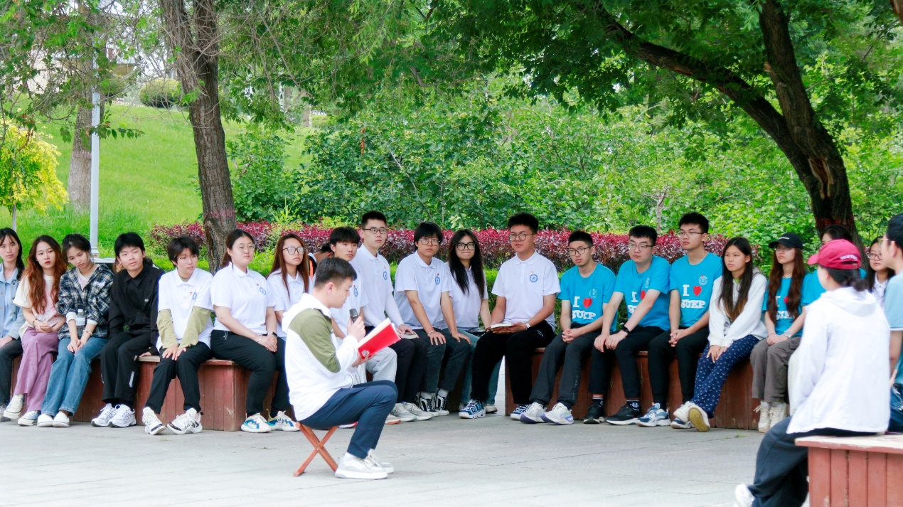 在将台堡红色广场,同学们集体学习微党课,交流《习近平与大学生朋友们》一书。